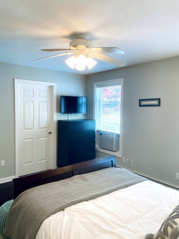 MASTER BEDROOM: First floor master bedroom off of the kitchen with Queen bed and en-suite bathroom with shower, as well as washer and dryer available for use. Closet space and dresser. Wall mounted Smart TV. Nightstand lamps with USB ports for charging.