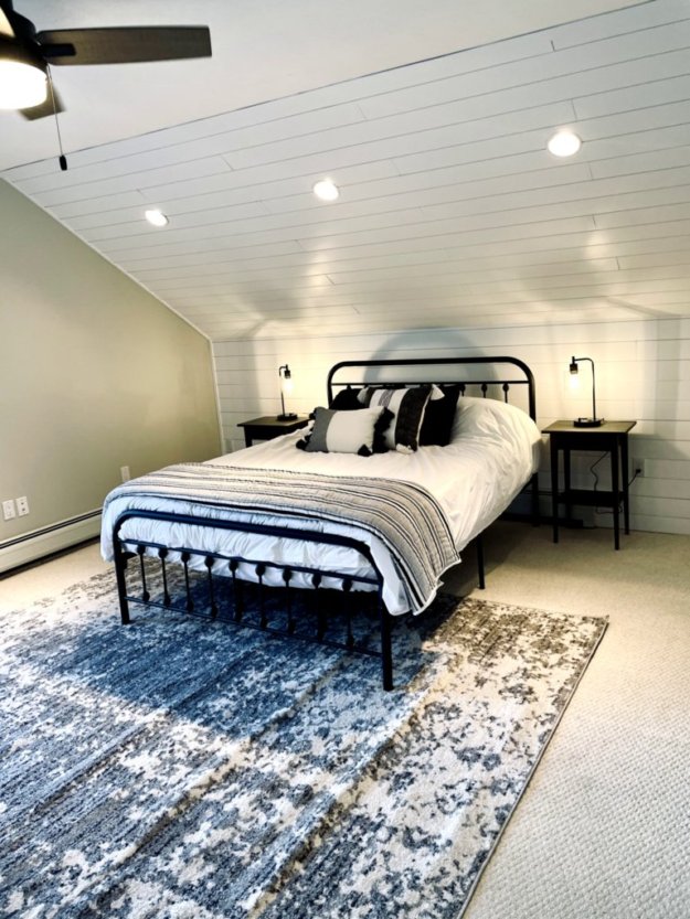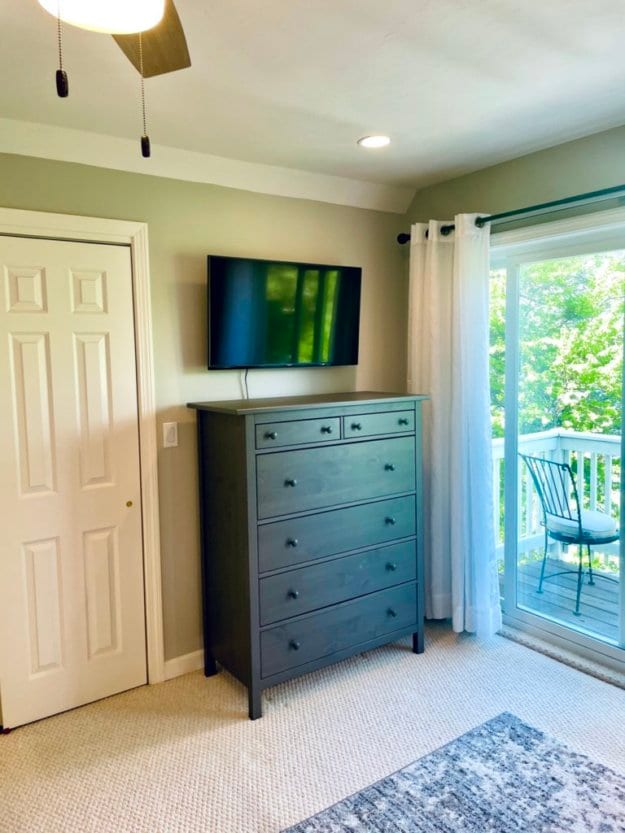 BEDROOM 2: Queen bed and Juliet balcony offering a bird’s eye view of the lake – sleep under a fabulous shiplap wall after a long day of swimming and boating. Ample closet space and dresser. Wall mounted Smart TV. Nightstand lamps with USB ports for charging.