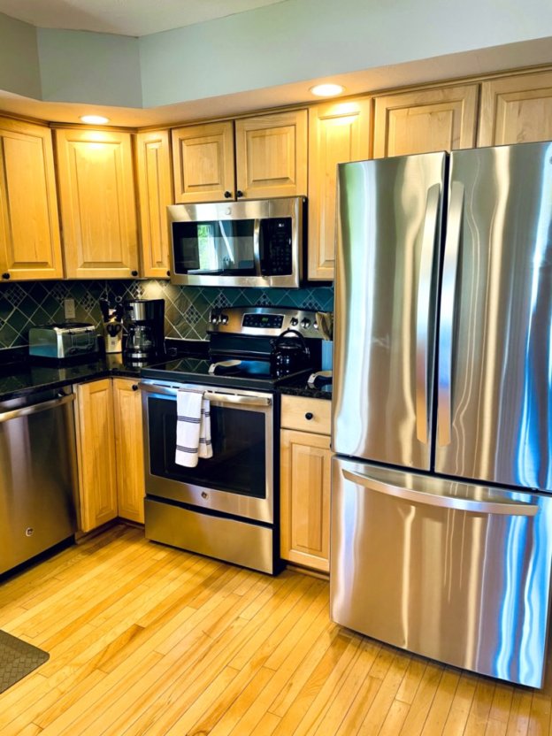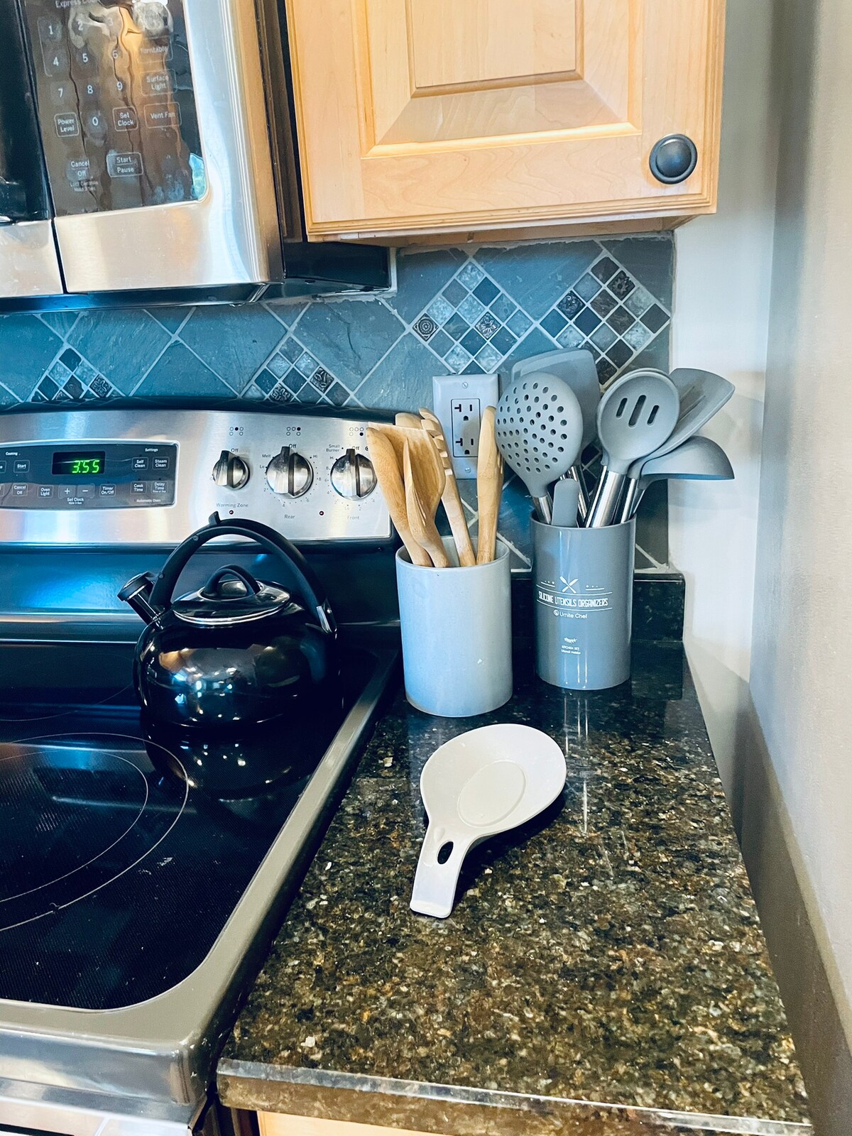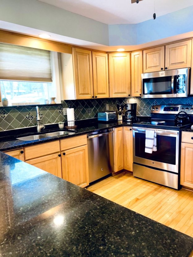 KITCHEN: Fully equipped, stainless steel appliances, dishwasher, large kitchen peninsula w/seating for four, electric stove and oven, granite counters, drip coffee maker, tea kettle, toaster, toaster oven, blender, cooking basics, baking sheets, mixing bowls, cooking utensils, dishware & flatware. Spices, cooking oil, coffee and filters, dish detergent and dishwashing pods, and general pantry items included. Outlet with two USB ports for charging.