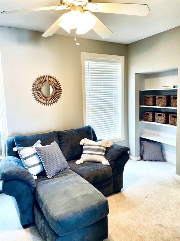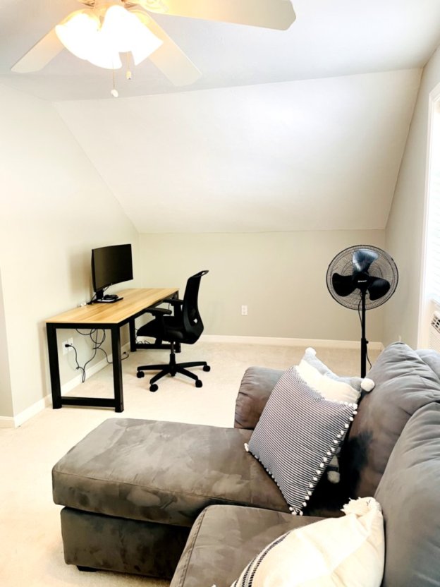 OFFICE AREA: Large, open hallway space between the two bedrooms boasts a desk with monitor, desk chair, charging station, as well as a couch to relax and baskets of toys to keep the kids entertained.