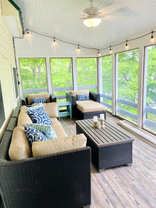 SCREENED PORCH: Modern patio furniture including couch, two chairs with ottomans, coffee table and side table to place your appetizers and drinks, looking over the lake, with twinkling patio lights and ceiling fan overhead.